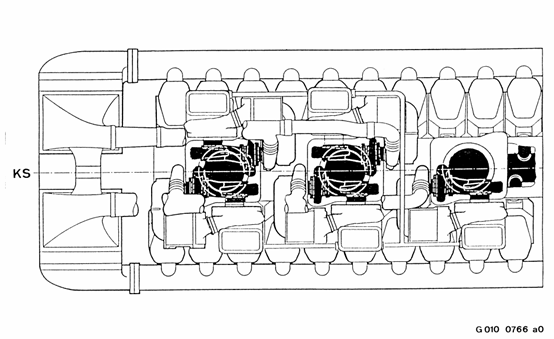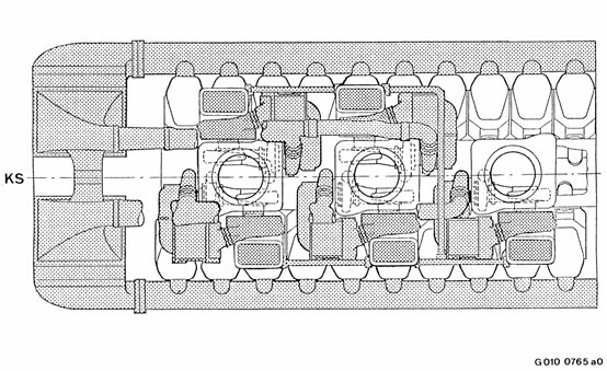MTU956 柴油機機身凈重20.7噸,共20缸V 形結構,總長約5670mm,機體用球墨鑄鐵制成,以保證足夠的剛度。鋼制的軸承蓋裝在軸承座中,依靠側壁與機體配合定位。主軸承蓋垂直方向用縱向拉緊螺栓,水平方向用橫向拉緊螺栓固定在機體的中分面上。曲軸由十三個滑動軸承支承在由機體中分面下軸承座和主軸承蓋組成的主軸承孔中,并在曲軸輸出端用一個由凸緣襯套和向心推力軸承組成的止推軸承實現軸向定位。兩根凸輪軸布置在機體中位置較高的地方,這樣可縮短推桿,從而有助于提高配氣機構剛度。由特種鑄鐵離心澆鑄成的濕式缸套從機體上方裝入,每只缸套上用凸肩密封,下方用密封環密封。排氣管是帶絕熱層的分段焊接結構,布置在V型夾角內。發動機回水管,五個雙級增壓器(A側兩個B側三個)和進氣總管都布置在V型夾角內,進氣處有六個進氣過濾器對氣體進行過濾。