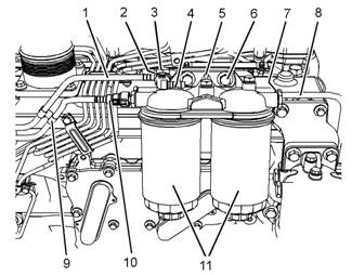 20.如有必要,將新的燃油濾清器(11)安裝到燃油濾清器底座(5)上。請參閱《操作和保養手冊》,“燃油系統細濾器-更換”以了解正確程序。