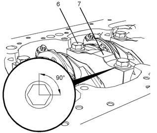 13.擰緊螺栓(6)至扭矩為80N·m(59lbft)。將螺栓(6)多轉90度。用工具(B)達到最終扭矩。
