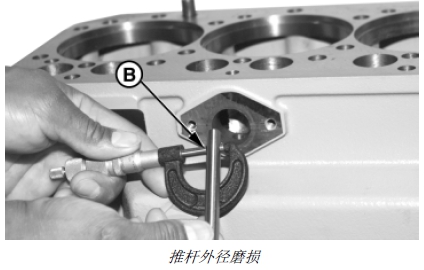 2. 測量推桿外徑 (B)。如果推桿外徑小于技術(shù)規(guī)格,應(yīng)安裝新推桿。
