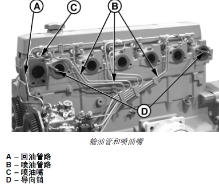 1. 將噴油嘴(C) 和噴油管(B) 作為一個總成安裝。參見相應步驟: