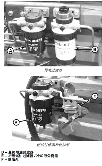 注意: 燃油過濾器(A) 和(B)、輸油泵(C) 的位置隨John Deere約翰迪爾強鹿柴油發動機和噴油泵型號的不同而有所改變。關于按要求拆卸過濾器和/ 或供油泵的步驟,請參見 CTM217(機械燃油系統)、CTM179 (配有 Bosch VP44泵的 4 級電子燃油系統)CTM341 (配有Stanadyne DE10 泵的 12 級電子燃油系統)或CTM284 (只有英文版)(配有 Delphi/LucasDP201 泵的 1 級電子燃油系統)的第 02 部分第090 章。