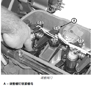 如果需要調整閥門,松開搖臂調節螺釘上的鎖緊螺母(A)。轉動調整螺釘直到塞尺的滑動略有阻力為止。用螺絲刀固定調整螺釘防止其轉動,同時按技術規格要求擰緊鎖緊螺母。擰緊鎖緊螺釘后再次檢查間隙。必要時,再次調整間隙。