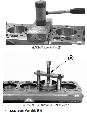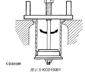 2. 在汽缸套對準(zhǔn)導(dǎo)向孔時,可以感到阻力。用KCD10001 (A) 或 JDG1145 汽缸套拉拔器完成汽缸套的安裝。