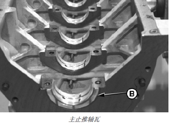 5. 對齊上下止推軸瓦,然后擰緊后主(止推)軸瓦帶帽螺釘。在曲軸和汽缸體加強筋間,用撬杠小心地將曲軸和主止推軸瓦蓋向后撬。然后,將曲軸向前移動使之與止推軸瓦表面對齊。