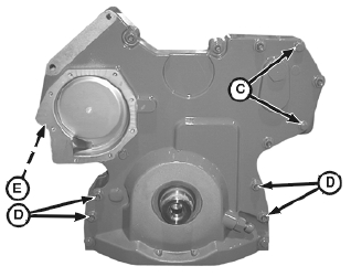 19. 拆卸正時齒輪蓋邊緣的帶帽螺釘 (C) 和John Deere約翰迪爾強鹿柴油發動機前板后面的帶帽螺釘 (E)。拆卸正時齒輪蓋。