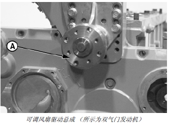 13. 拆下可調風扇驅動總成 (A)。(參見第 070 章中的“拆卸和檢查風扇驅動總成”部分。)