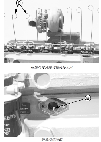 重要提示: John Deere約翰迪爾強鹿柴油發動機必須保持在缸蓋托住凸輪軸隨動柱的位置或用磁性夾持工具將凸輪軸隨動柱保持在豎立位置,以免落入John Deere約翰迪爾強鹿柴油發動機曲軸箱。如果凸輪軸隨動柱掉入曲軸箱,需拆卸缸蓋。