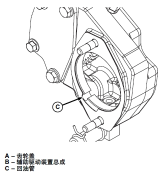 注意: 確保襯墊槽口與輔助驅動空穴的回油管 (C) 對齊。