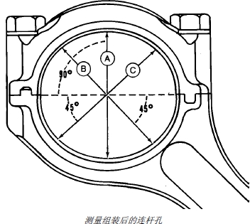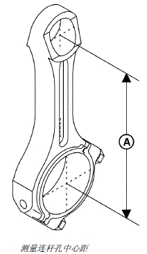 9. 測量連桿活塞銷孔中心到曲軸孔中心的尺寸 (A),并與給定的技術規格比較。如果測量值不符合技術規格要求,應更換連桿。