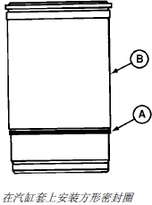 5. 將汽缸套 (B) 上下倒置,并在汽缸套外圈上安裝氯丁(二烯)橡膠四方形密封圈 (A)。