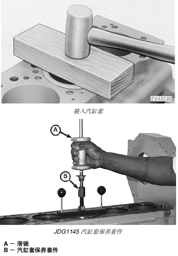 3. 使用上圖所示的干凈硬木塊和錘子或下圖所示的JDG1145 汽缸套保養(yǎng)套件 (B) 和 2.27 千克(5 磅) 滑錘來完成汽缸套的裝入。