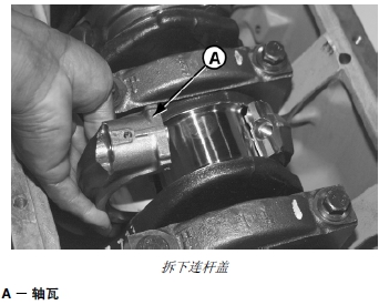 8. 拆下所有帶軸瓦的連桿蓋 (A),然后卸下第 1 和第 7 個(gè)主軸瓦蓋和軸瓦。(參見第 030 章中的“拆下活塞和連桿”部分。)