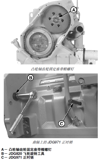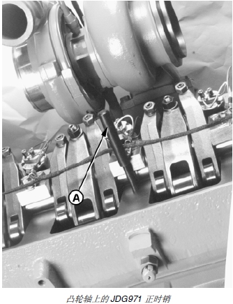 重要提示: 必須在 JDG971 正時銷插入凸輪軸正時槽(A) 后再將第二個正時銷插入凸輪軸正時槽 (C)。
