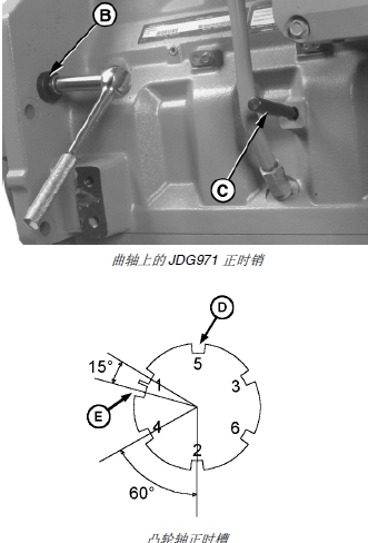 3. 按照運轉方向(從后面看是逆時針方向)旋轉發(fā)動機飛輪,直到 JDG971 正時銷 (A) 嚙合到凸輪軸的單正時槽 (D)。旋轉發(fā)動機時,從凸輪軸正時銷孔查看凸輪軸正時凸緣,應該能夠找到正確的正時槽。如果正時銷裝入正時槽 (D),雙正時槽 (E) 應在接近時鐘 11 時的位置(從發(fā)動機后側看)。這樣能夠確保發(fā)動機鎖定在 1 號汽缸壓縮沖程的上止點。一號汽缸上的進氣和排氣搖臂應松弛。