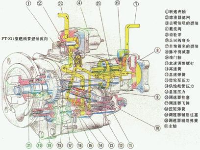 PT燃油系統的基本結構形式:它由油箱、燃油濾清器、PT燃油泵、低壓輸油管、噴油器、搖臂、推桿、噴油凸輪和回油管等組成。其中:PT燃油泵又包括:齒輪泵、磁性濾清器、脈沖膜片減振器、兩極調速器、 節流軸、電磁閥等。