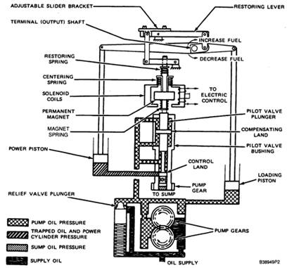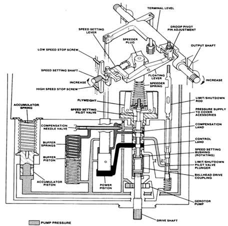 動力活塞同傳動器的終端(輸出)軸相連,發動機的燃料架聯動裝置也與終端軸相連。當發動機的負載發生改變時,動力活塞的運動會轉動終端軸,聯動裝置將使燃料架移動到新的設定之上,從而與新負載條件下的發動機速度保持一致。