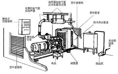 3. 典型的機房布置應具有來自散熱器的熱風用導風管道排至機房外并且避免回流 排氣系統從屋頂進行支撐,安裝彈性波紋管來隔離引擎和排氣系統熱風導出管道,燃油管路和電氣相對引擎和交流發電機的連接,留有一點的余量日用油箱通過機房外遠置安裝的油庫供應在發動機沒有運行期間,啟動電池必須使用充電器充滿,該充電器可以集成在控制柜內。