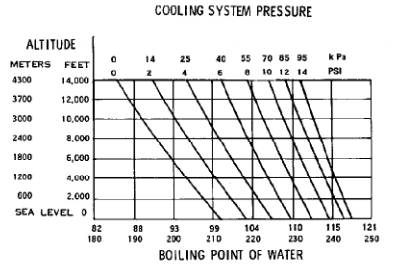 沸點(diǎn)受三種因素影響:壓力,海拔和冷卻液中的乙二醇濃度。液體沸點(diǎn)隨著壓力增加而增加。液體沸點(diǎn)隨著海拔高度增加而降低。圖39顯示壓力和海拔對(duì)水的沸點(diǎn)的影響。