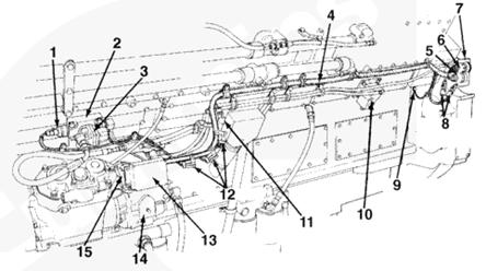 1油軌壓力傳感器,2燃油連接塊,3燃料切斷閥4發動機線束,5 C6 接頭,6 C5 接頭,7 OEM C5 和 C6 接頭支架,8發動機轉速傳感器,9系統接地接頭,10液壓機械式 STC 執行器,11發動機側數據通信接頭,12保險絲 (5A),13 ECM,14燃油泵,15電子燃油控制閥。