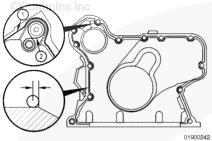 注: 安裝三個導向銷(零件號 3164977)以改進前蓋和前油封與齒輪室和曲軸的對準情況。