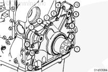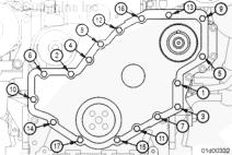 注: 安裝前齒輪室蓋前,先確保在缸體、油底殼與前齒輪室蓋的相互接合面上涂敷了密封膠(零件號 3164067)。