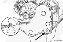 將康明斯前齒輪室蓋安裝到缸體安裝螺釘上,將油底殼安裝到前齒輪室蓋安裝螺釘上。這時不要擰緊螺釘。