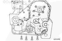 安裝齒輪室殼體并將 10 顆 (M10-1.50 x 25) 的螺栓裝入齒輪室內(nèi)部。在殼體的外表面安裝 5 顆 (M10-1.50 x 50) 螺栓。拆下導(dǎo)向銷,安裝剩下的兩顆 (M10-1.50 x 25) 螺栓。