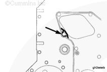 在齒輪室殼體后部的凹槽中涂抹一圈密封膠(零件號(hào) 3823494)。完全注滿凹槽,使密封膠高于齒輪室殼體的缸體安裝表面大約 1/16 到 1/8 英寸。