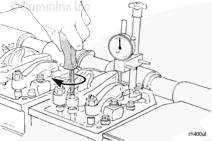 擰緊調節螺釘,直到康明斯噴油器柱塞到達油杯底部。將千分表歸零。前后轉動調節螺釘 2 到 3 次,確認歸零設置。