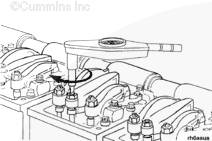 使用度盤式扭矩扳手擰緊康明斯噴油器搖臂的調節螺釘。如果在調節時引起調節螺釘發出嘎嘎聲,則需要維修調節螺釘和搖臂。