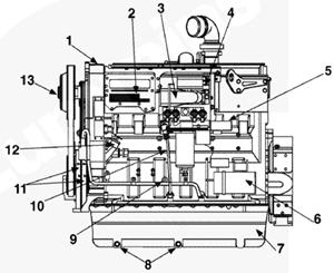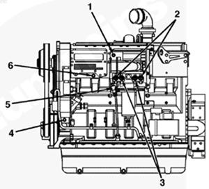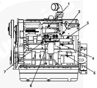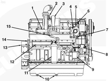 1排氣歧管,2渦輪增壓器機(jī)油進(jìn)口,3渦輪增壓器,4節(jié)溫器殼通風(fēng)口,5節(jié)溫器殼,6發(fā)動機(jī)冷卻液出口,7冷卻液溫度傳感器,8水泵,9冷卻液濾清器,10發(fā)動機(jī)放油口,11組合式全流/旁通機(jī)油濾清器,12機(jī)油冷卻器,13飛輪殼,14發(fā)動機(jī)生產(chǎn)序號(ESN),15渦輪增壓器機(jī)油回油口。