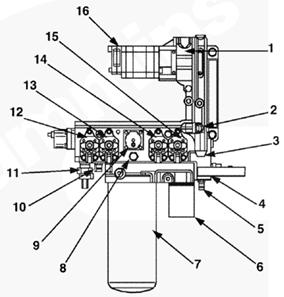 1加注旁通閥(內(nèi)部),2 320-psi 壓力調(diào)節(jié)器,3 36-mc 濾清器濾網(wǎng),4燃油進(jìn)口管接頭/進(jìn)口濾清器殼,5快斷壓力鎖片 — 吸入側(cè),6燃油加注泵,7燃油濾清器,8 250-psi 壓力調(diào)節(jié)器,9燃油切斷閥,10快斷壓力鎖片 — 壓力側(cè),11燃油壓力傳感器,12前油軌執(zhí)行器,13前正時(shí)執(zhí)行器,14后正時(shí)執(zhí)行器,15后油軌執(zhí)行器,16燃油泵總成。