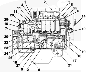 1渦輪增壓器進(jìn)口接頭,2 ATA 跨接接頭,3組合式機(jī)油濾清器,4高壓燃油管,5冷卻液出口接頭,6吊耳,7飛輪殼,8放油口,9右排燃油泵,10風(fēng)扇皮帶惰輪總成,11燃油進(jìn)口管接頭,12加油管,13燃油供應(yīng)泵殼,14風(fēng)扇輪轂,15燃油濾清器,16冷卻液添加劑,17冷卻液泵,18燃油切斷閥 2(右排),19進(jìn)氣歧管壓力傳感器 2(右排),20進(jìn)氣歧管溫度傳感器 2(右排),21冷卻液進(jìn)口接頭,22機(jī)油輸送管,23 Centinel 驅(qū)動(dòng)器接頭,24 Centinel 油箱油位開(kāi)關(guān)接頭,25充電機(jī),26溢流閥,27燃油出口管接頭,28供油壓力傳感器,29供油溫度傳感器,