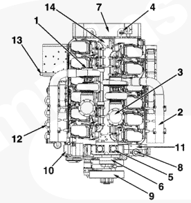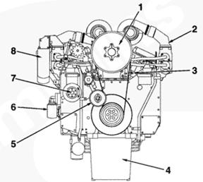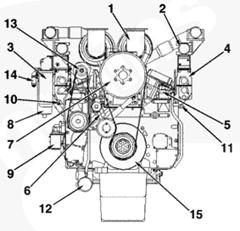 1渦輪增壓器進(jìn)口接頭,2 ATA 跨接接頭,3排氣口接頭,4發(fā)動(dòng)機(jī)轉(zhuǎn)速傳感器,5冷卻液出口接頭,6前吊耳,7飛輪殼,8曲軸箱通風(fēng)裝置,9風(fēng)扇輪轂,10充電機(jī),11冷卻液液位開(kāi)關(guān)接頭,12組合式機(jī)油濾清器,13燃油進(jìn)口管接頭,14后吊耳。