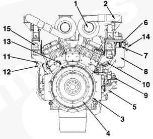 1渦輪增壓器排氣接頭,2 ATA 跨接接頭,3組合式機(jī)油濾清器,4中冷器殼/進(jìn)氣歧管,5曲軸箱通風(fēng)裝置,6風(fēng)扇皮帶惰輪總成,7風(fēng)扇輪轂,8燃油濾清器,9冷卻液添加劑,10進(jìn)氣歧管壓力傳感器 2(右排),11進(jìn)氣歧管壓力傳感器 1(左排),12冷卻液進(jìn)口接頭,13充電機(jī),14燃油進(jìn)口管接頭,15減振器。