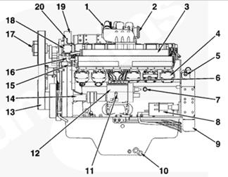 1空氣跨接殼體,2渦輪增壓器,3全流式機(jī)油濾清器,4出水口接頭,5吊耳,6風(fēng)扇皮帶惰輪總成,7水旁通管,8風(fēng)扇皮帶惰輪皮帶輪,9水濾器,10水泵,11進(jìn)水口接頭,12機(jī)油加注管,13輸油泵,14放油口,15燃油濾清器,16燃油泵,17機(jī)油旁通濾清器,18機(jī)油輸送管,19進(jìn)氣歧管。
