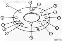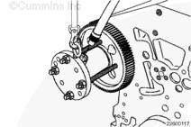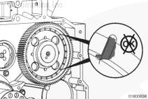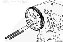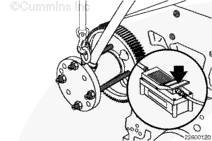 如果需要,旋轉曲軸以使凸輪軸齒輪上的孔與止推板上的螺栓孔相通安裝兩顆止推板安裝螺栓。擰緊螺栓。扭矩值: 45 n.m [33 ft-lb]