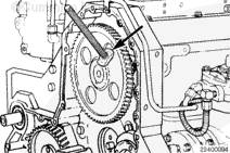 如果凸輪軸齒輪已更換,檢查噴油器正時;加工公差可造成正時超出技術規范。參考第 6 節中的步驟 006-025。安裝凸輪軸惰輪。確保所有的正時標記都正確匹配。