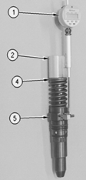 安裝145-5191千分表支架在氣門蓋底端的螺絲孔(2). 調整在氣門過橋( 4 )上端的接觸表面( 3 ).