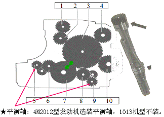 1.調速器驅動齒輪,2.惰輪,3.凸輪軸齒輪,4.液壓泵齒輪,5.平衡軸齒輪,6.惰輪,7.曲軸齒輪,8.惰輪,9.平衡軸齒輪,10.壓縮機齒輪,