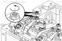 當標記對準康明斯ISX15 CM2250發動機齒輪室蓋上的指示箭頭并且兩個氣門關閉時,松開進氣和排氣門調節螺釘上的鎖緊螺母。將調節螺釘旋松一到兩圈。