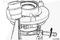 若要安裝渦輪殼,在軸承座上定位 v 形帶箍,對(duì)齊在拆解期間所做的墨水標(biāo)記。