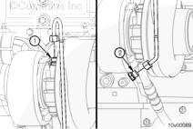 將渦輪增壓器供油管安裝到渦輪增壓器軸承殼體陽(yáng)性接頭 (1) 上。供油軟管必須直接朝下,以便正確連接到機(jī)油濾清器座 (2) 上的供油管接頭上。