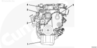 1. 發(fā)動(dòng)機(jī)油底殼 2. 發(fā)動(dòng)機(jī)機(jī)油濾清器 3. 自動(dòng)皮帶張緊器 4. 發(fā)動(dòng)機(jī)吊耳 5. 發(fā)動(dòng)機(jī)機(jī)油加注口蓋。