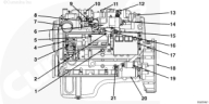 1. 發(fā)動(dòng)機(jī)機(jī)油壓力/溫度傳感器 2. 燃?xì)赓|(zhì)量流量傳感器 3. 發(fā)動(dòng)機(jī)轉(zhuǎn)速/位置傳感器 4. 空氣壓縮機(jī) 5. 點(diǎn)火控制模塊 (ICM) 6. 燃料殼體 7. 進(jìn)氣彎頭 8. 發(fā)動(dòng)機(jī)油門執(zhí)行器 9. 油門進(jìn)氣壓力傳感器 10. 點(diǎn)火線圈 11. 排氣背壓傳感器 12. 燃料進(jìn)口接頭 13. 發(fā)動(dòng)機(jī)吊耳 14. 燃料壓力調(diào)節(jié)器 15. 燃料調(diào)節(jié)器進(jìn)口壓力傳感器 16. 燃料控制閥 17. 電子控制模塊 (ECM) 18. 飛輪殼體 19. 起動(dòng)馬達(dá)電磁閥 20. 起動(dòng)馬達(dá) 21. 爆震傳感器。