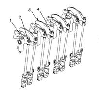 1、 進氣門搖臂 2、調整螺釘 3、排氣門搖臂 4、調整螺釘