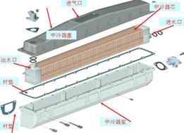 結構及工作原理:中冷器由殼體、中冷器芯構成;中冷器芯的管道與發動機冷卻系統連接,當發動機運轉時,一部分冷