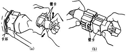 (14)在拆下導線連接器時,要注意松開鎖緊彈簧(卡環)或按下鎖扣(圖a);在安裝導線連接器時,應注意一定要插到底并鎖好鎖止器(鎖卡),如果圖(b)所示。